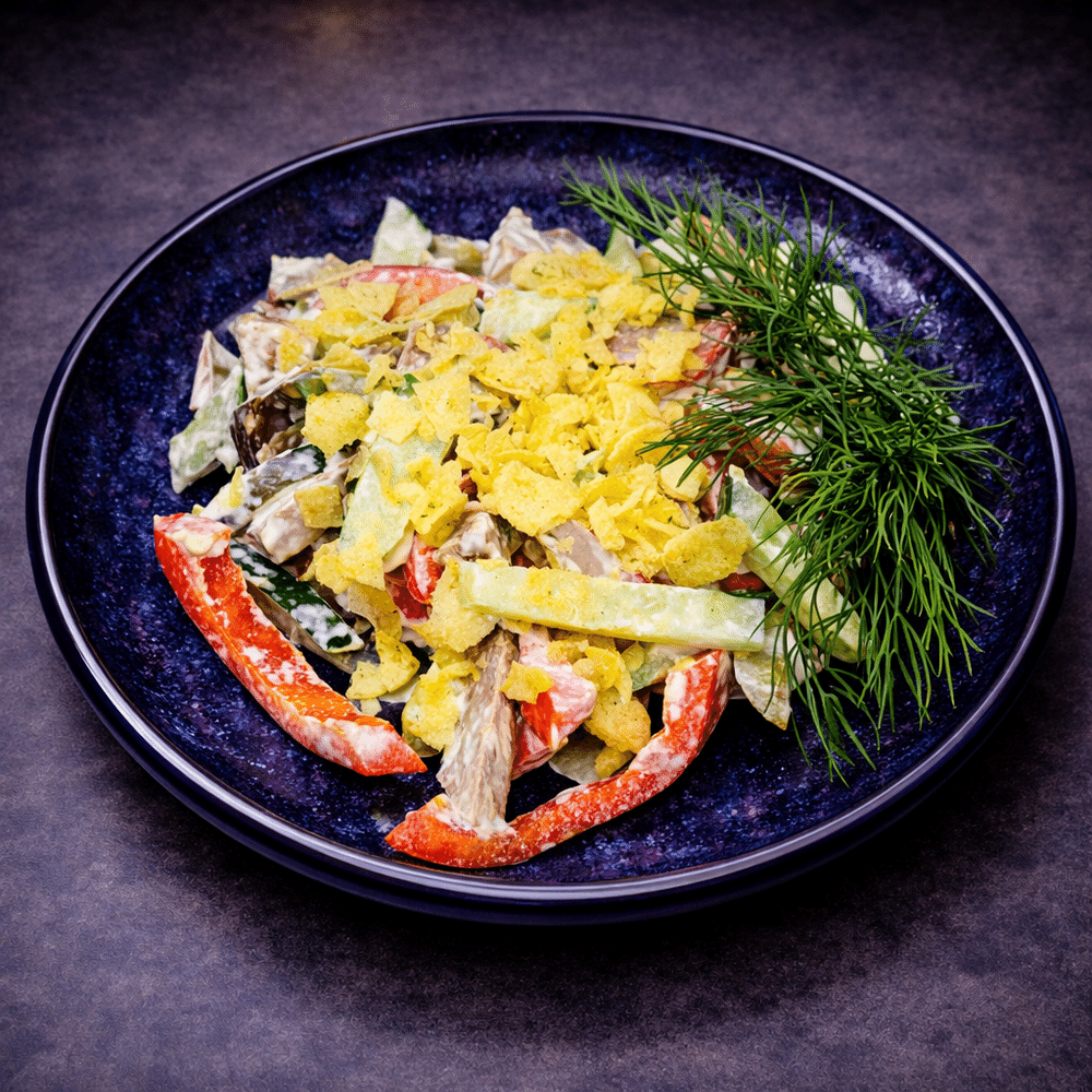 Отварная говядина,огурцы свежие, огурцы маринованные,чипсы луковые, майонез
