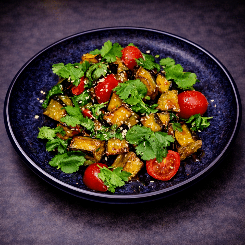 (Баклажаны, помидоры черри, кинза, соус сладкий чили)