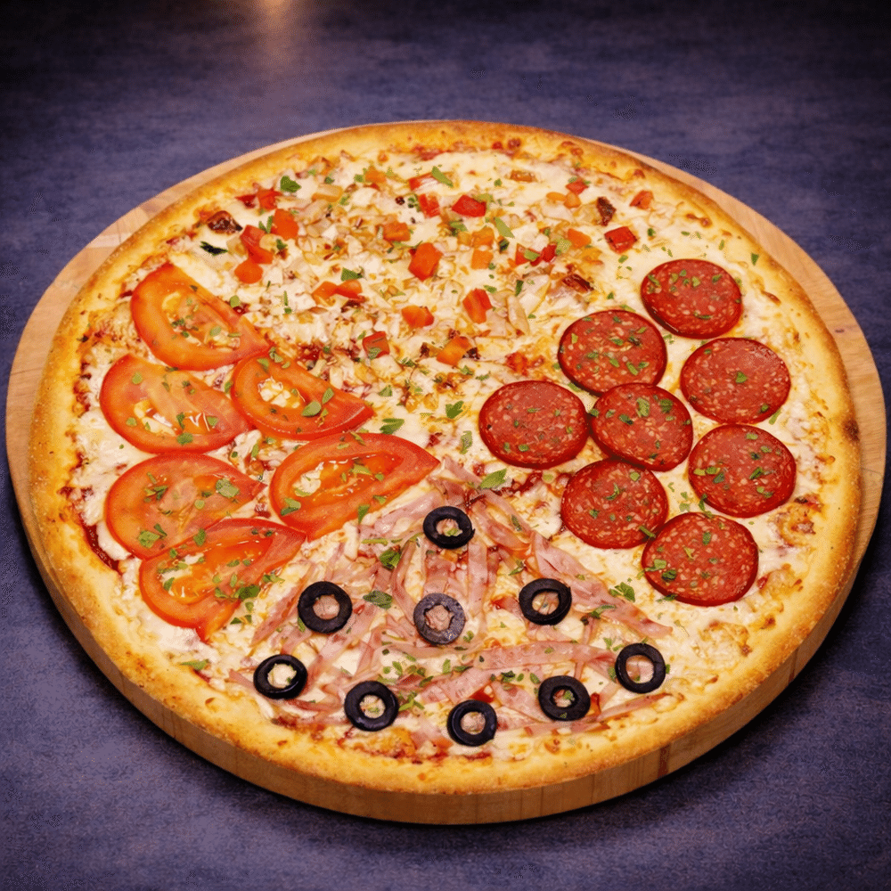 Соус томатный, маслины, моцарелла, колбаски, брынза