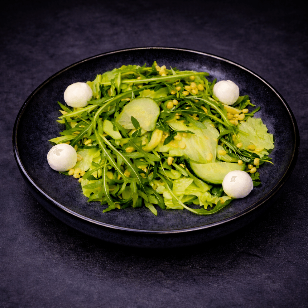 Айсберг, рукола, яблоко, огурец свеж., сельдерей, мини моцарелла, заправка медово-горчичная с оливковым маслом.