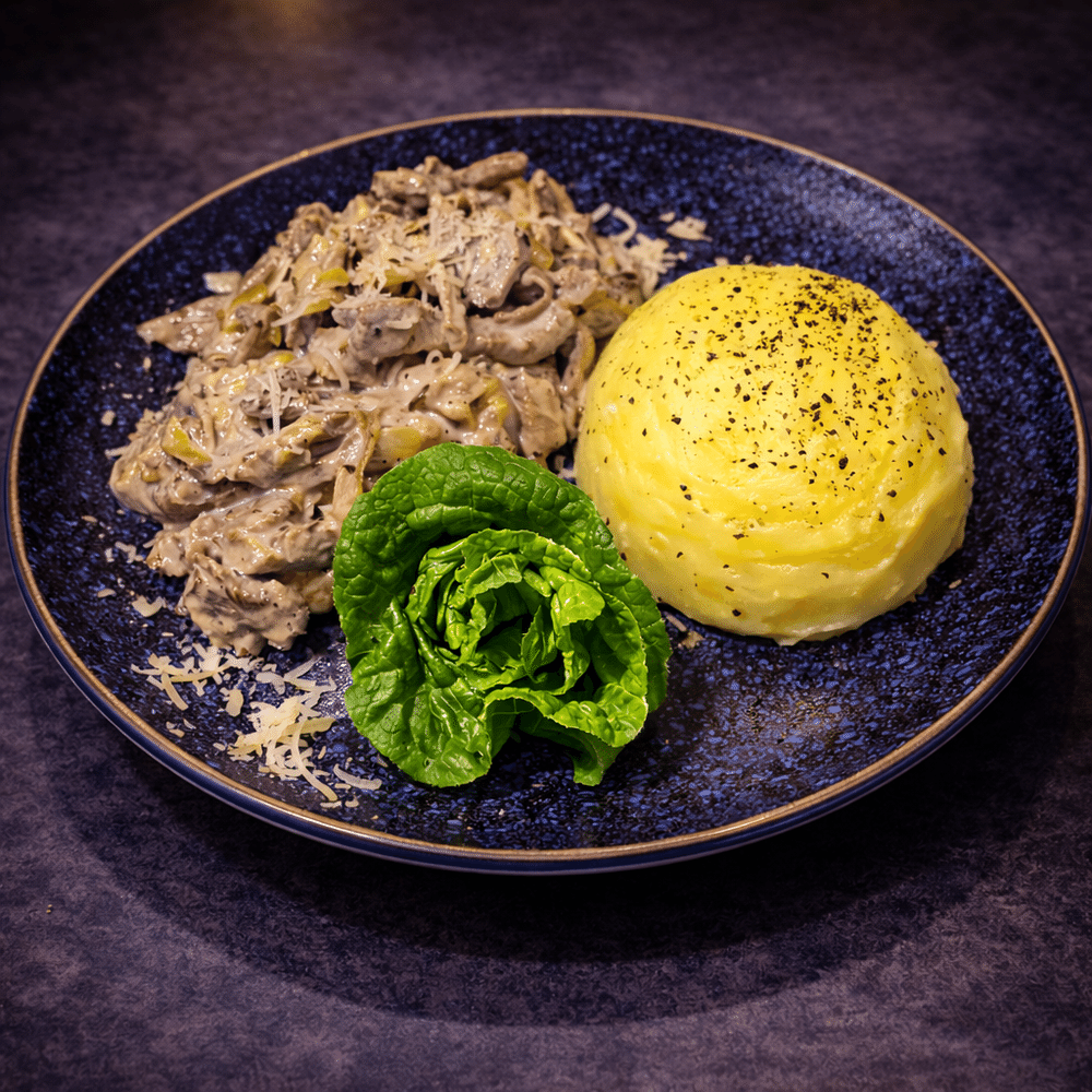 ( вырезка говядины, белые грибы, лук репчатый, сливки, картофельное пюре)
