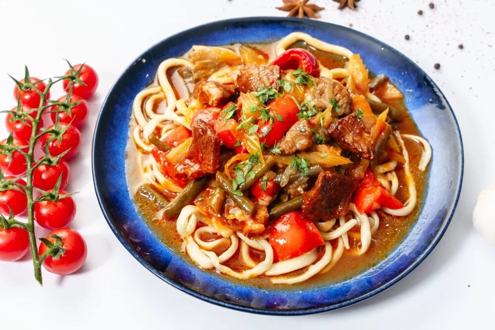Мясо говядина, пекинский салат, сельдерей, болгарский перец, стручковая фасоль, чеснок, лапша по-домашнему