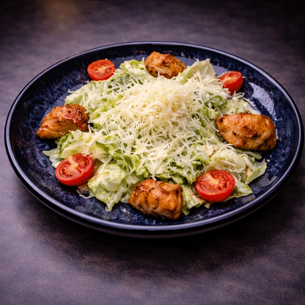 Айсберг, гренки, курица жареная, сыр пармезан, помидоры черри, соус цезарь