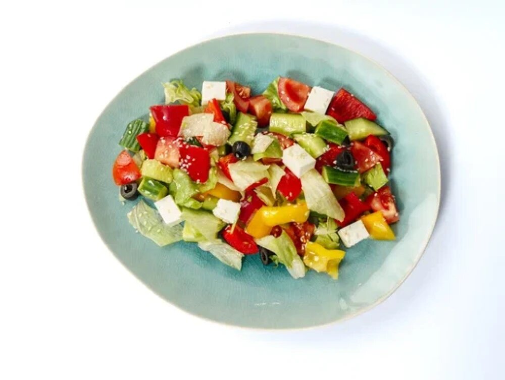 Огурцы, помидоры, болгарский перец, айсберг, оливки, сыр фетакса