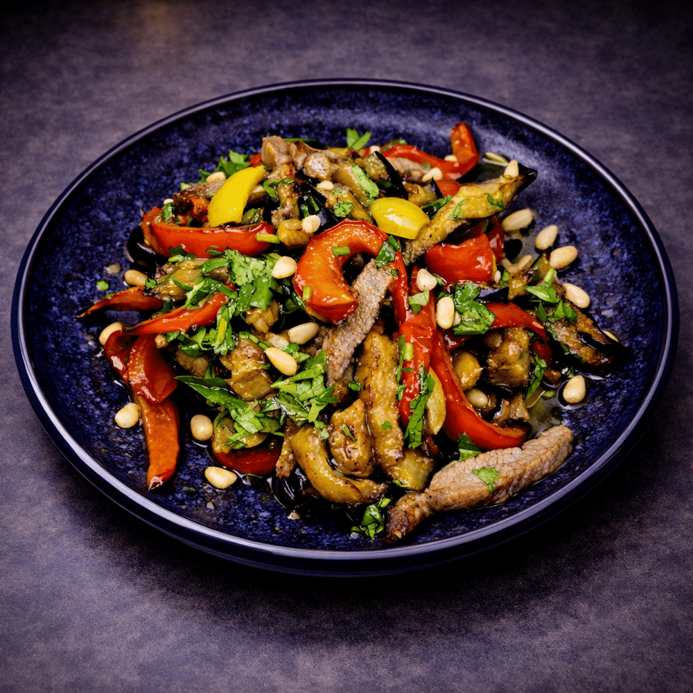 Баклажаны жареные, перец болгарский, телятина, кинза, кедровый орех, соевый соус