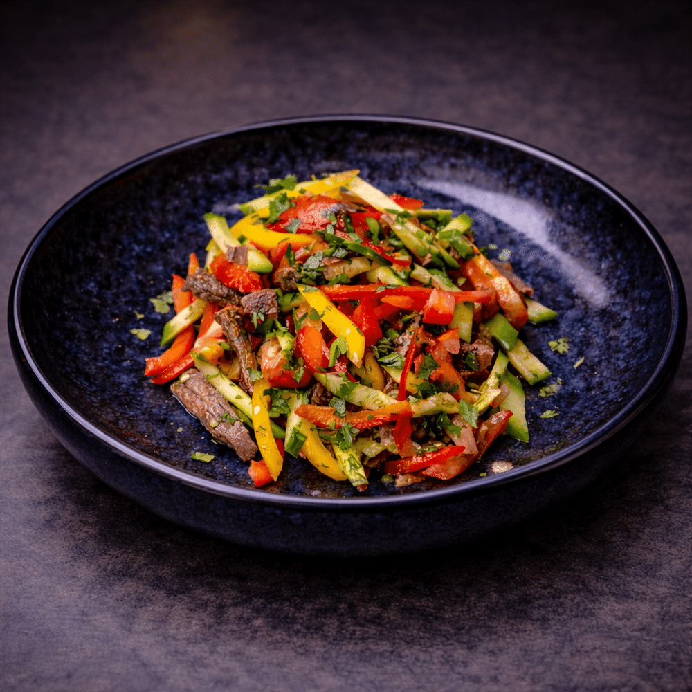 Говядина, огурцы, помидоры, болгарский перец, зелень, оливковое масло